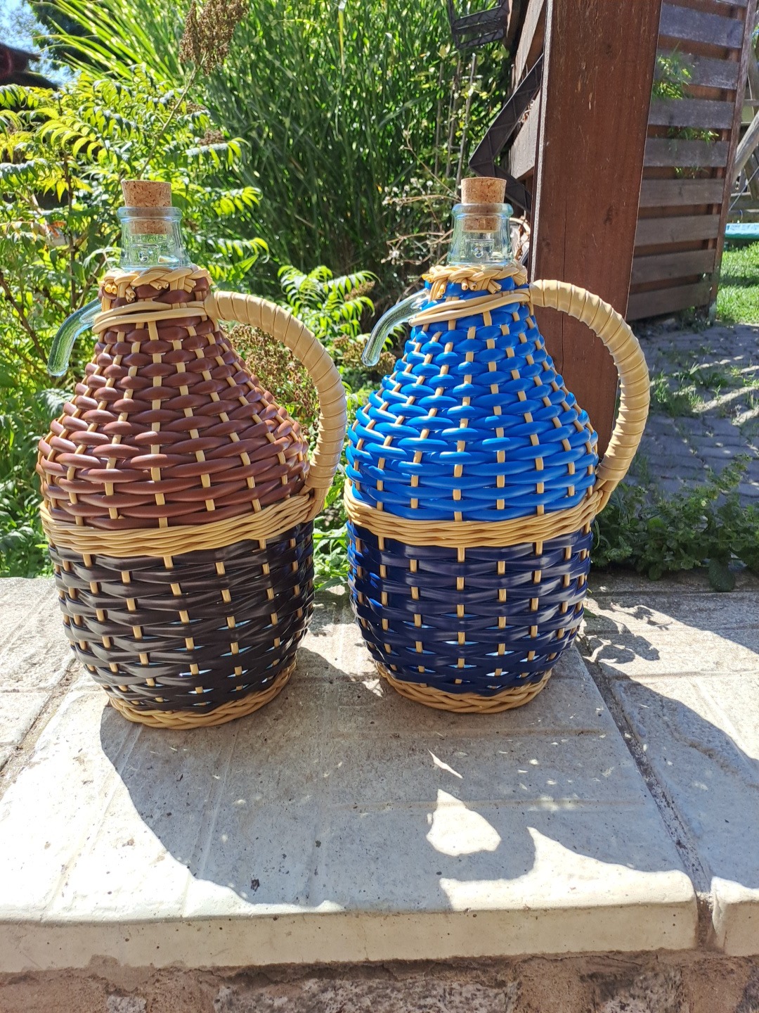Demižon 3 litry opletený plastem s korkovou zátkou. Skladem sklo z poslední fotky se skleněným ouškem.